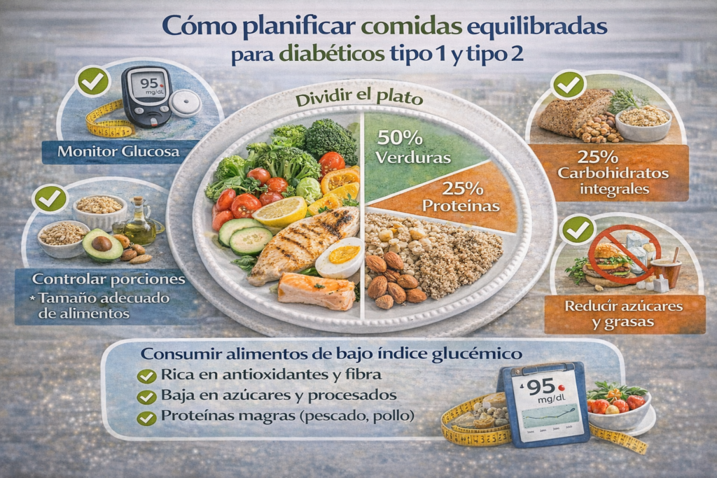 Tener un plan alimenticio bien estructurado es una de las herramientas más eficaces para gestionar la diabetes, ya sea tipo 1 o tipo 2. Planificar comidas equilibradas te ayuda a mantener estables tus niveles de glucosa en sangre, evitar tanto subidas pronunciadas (hiperglucemias) como bajadas peligrosas (hipoglucemias), y garantizar que obtienes todos los nutrientes que tu cuerpo necesita diariamente. A continuación, presentamos estrategias y métodos recomendados por expertos –incluyendo el popular Método del Plato y el conteo de carbohidratos– para que puedas armar menús saludables adaptados a la diabetes. También discutiremos brevemente las diferencias en la planificación para diabetes tipo 1 vs tipo 2. f